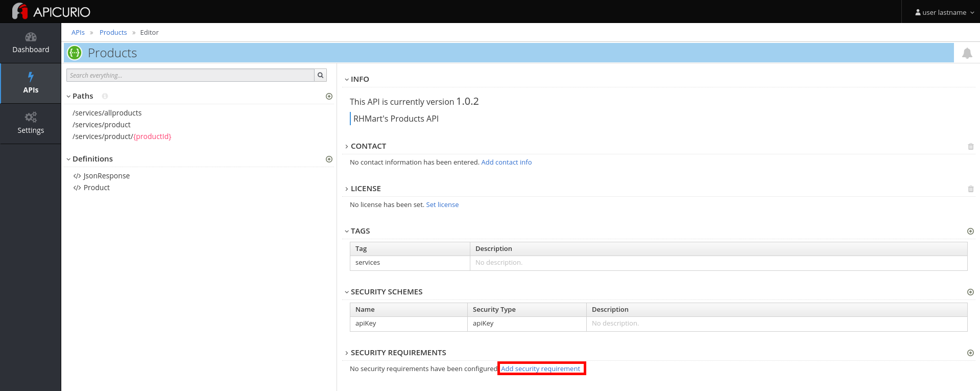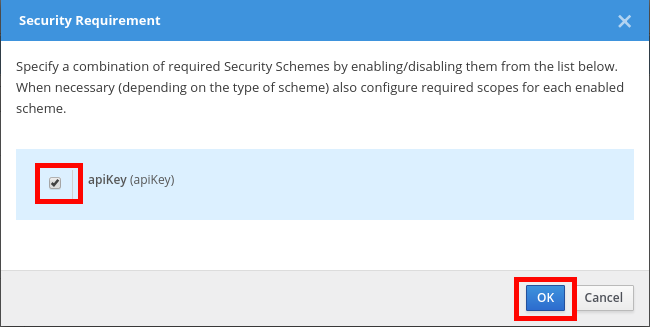 - Check the apiKey security requirement.